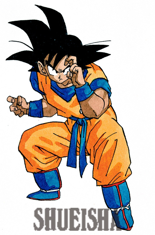 カードダス風の綴込み付録のために描き下ろされた悟空のイラスト。実際の誌面ではバストアップで掲載されていたので、全身を見ることができる貴重な原画だ。フリーザと対立するイメージで描かれたため、戦闘モードで力強く構えている。